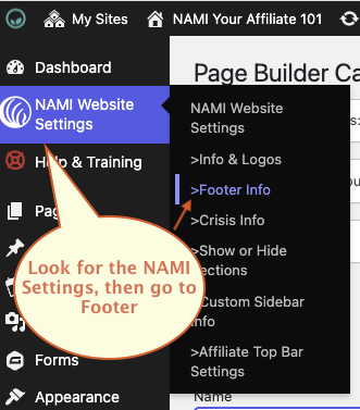 To edit the information in the Global Footer, go to your WordPress dashboard. From there, navigate to NAMI Website Settings, then Footer Info.