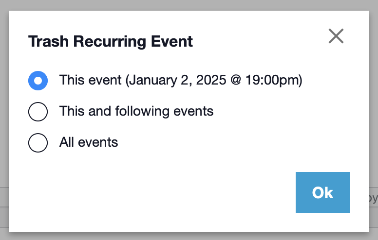 Option 2: Open the event you want to delete from the calendar on the front-end. Click on "Edit Event" at the top. Then, select "Trash" and choose "This event".