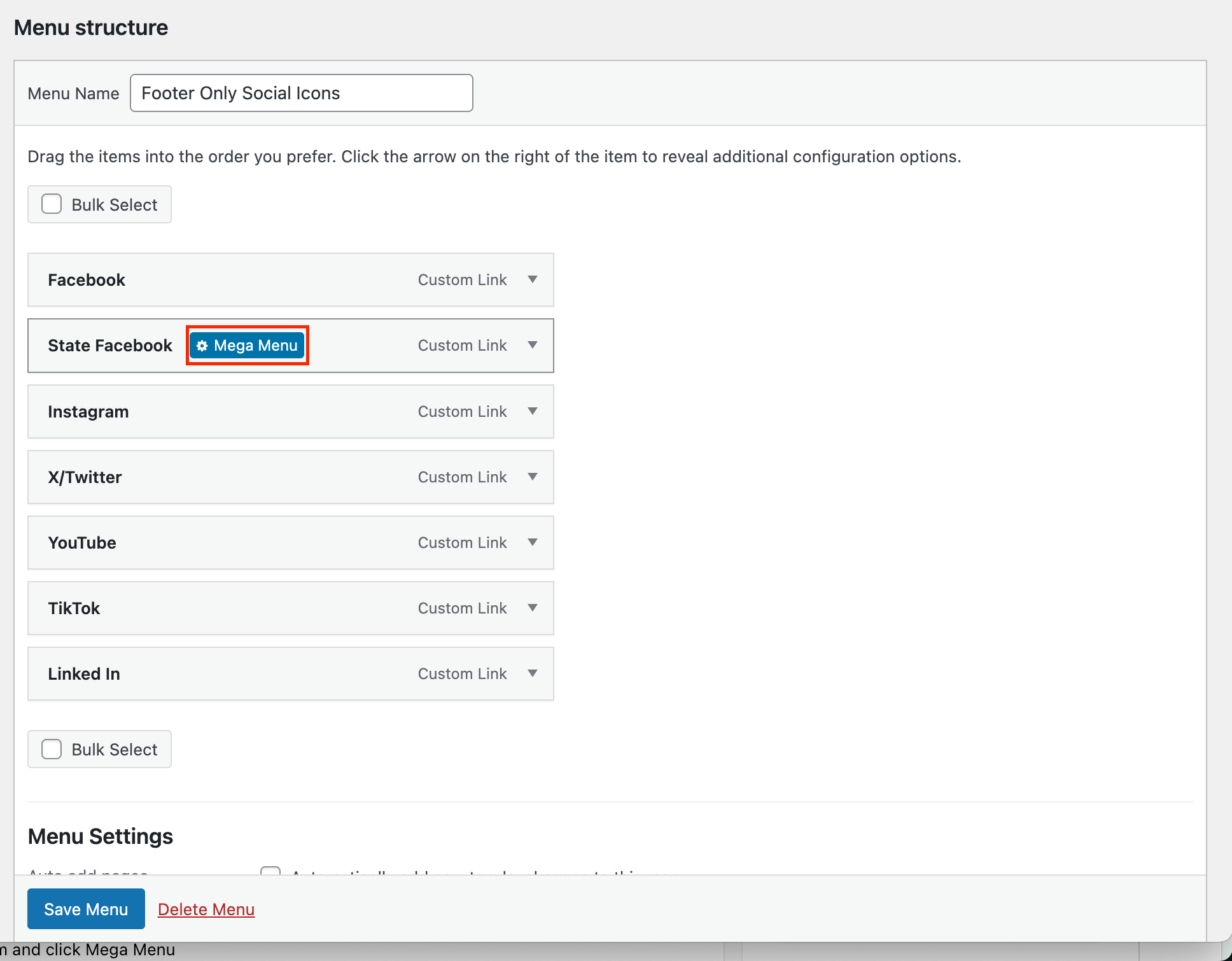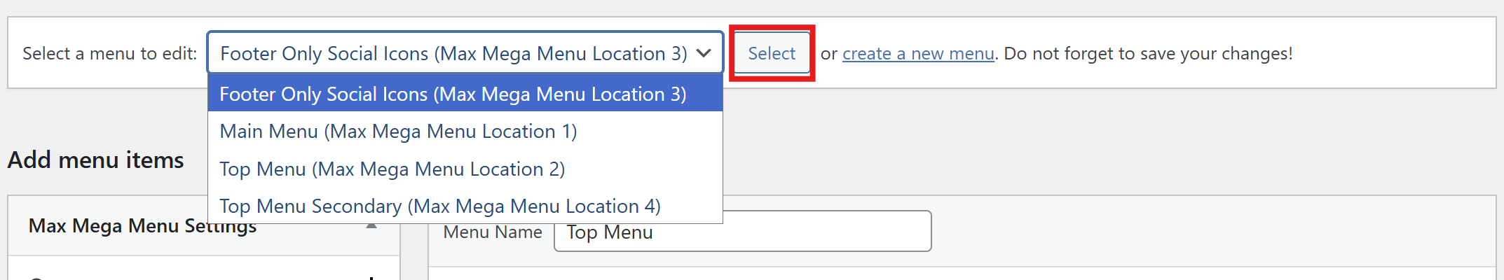 In the dropdown for Select a menu to edit, select Footer Only Social Icons (Max Mega Menu Location 3).