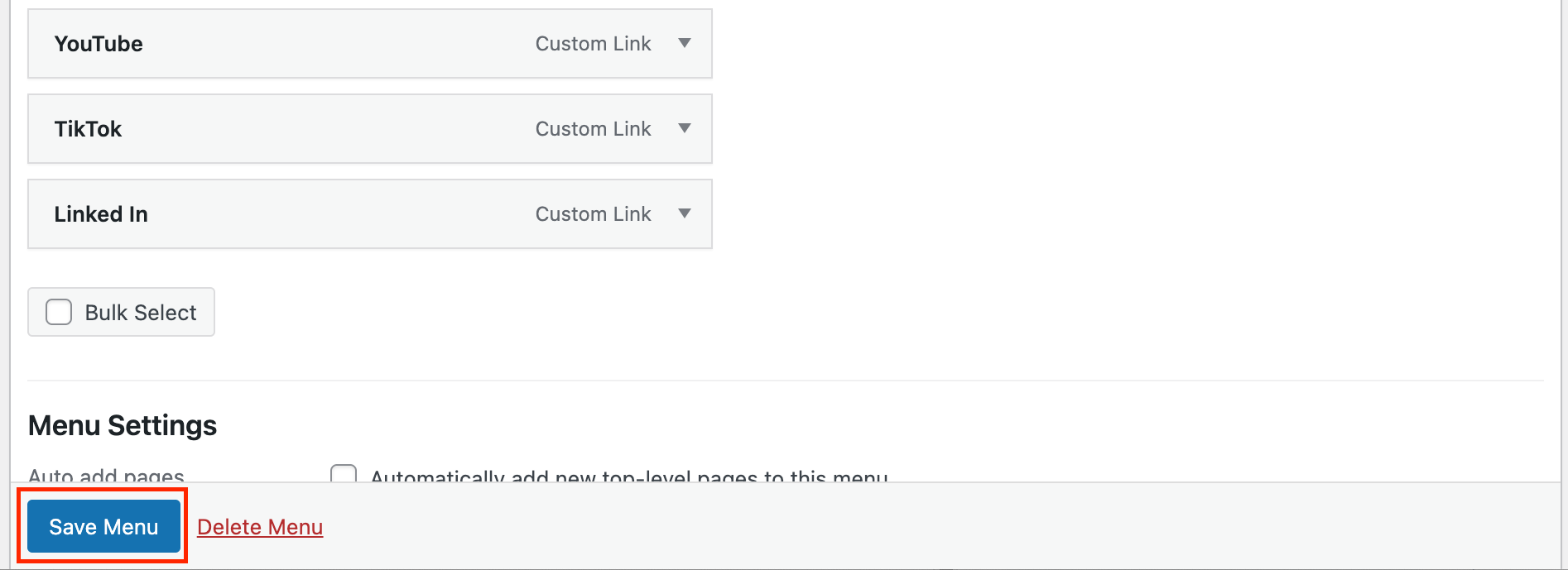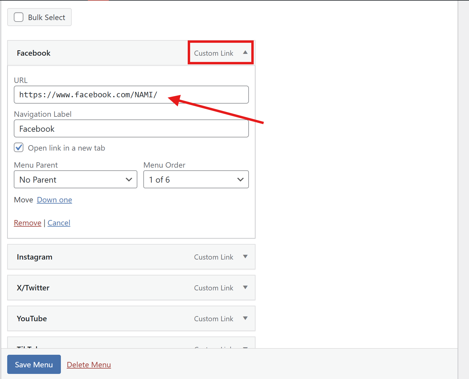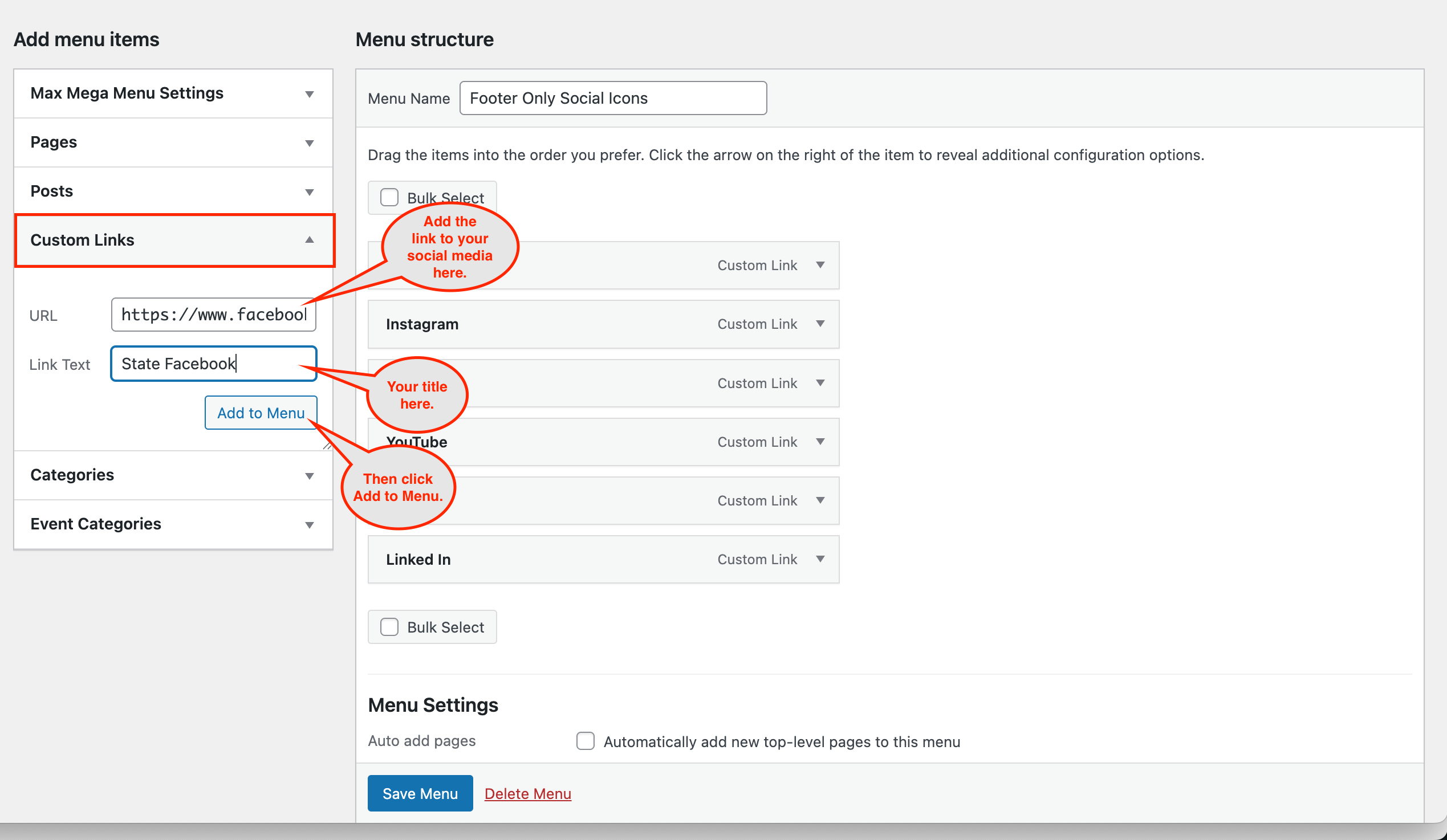 If you need to add a new social media link, click on the Custom Link option under the Add menu items menu on the left. Paste in your social media link into the URL section. You can type any title you will recognize as Link Text. Then click Add to Menu.