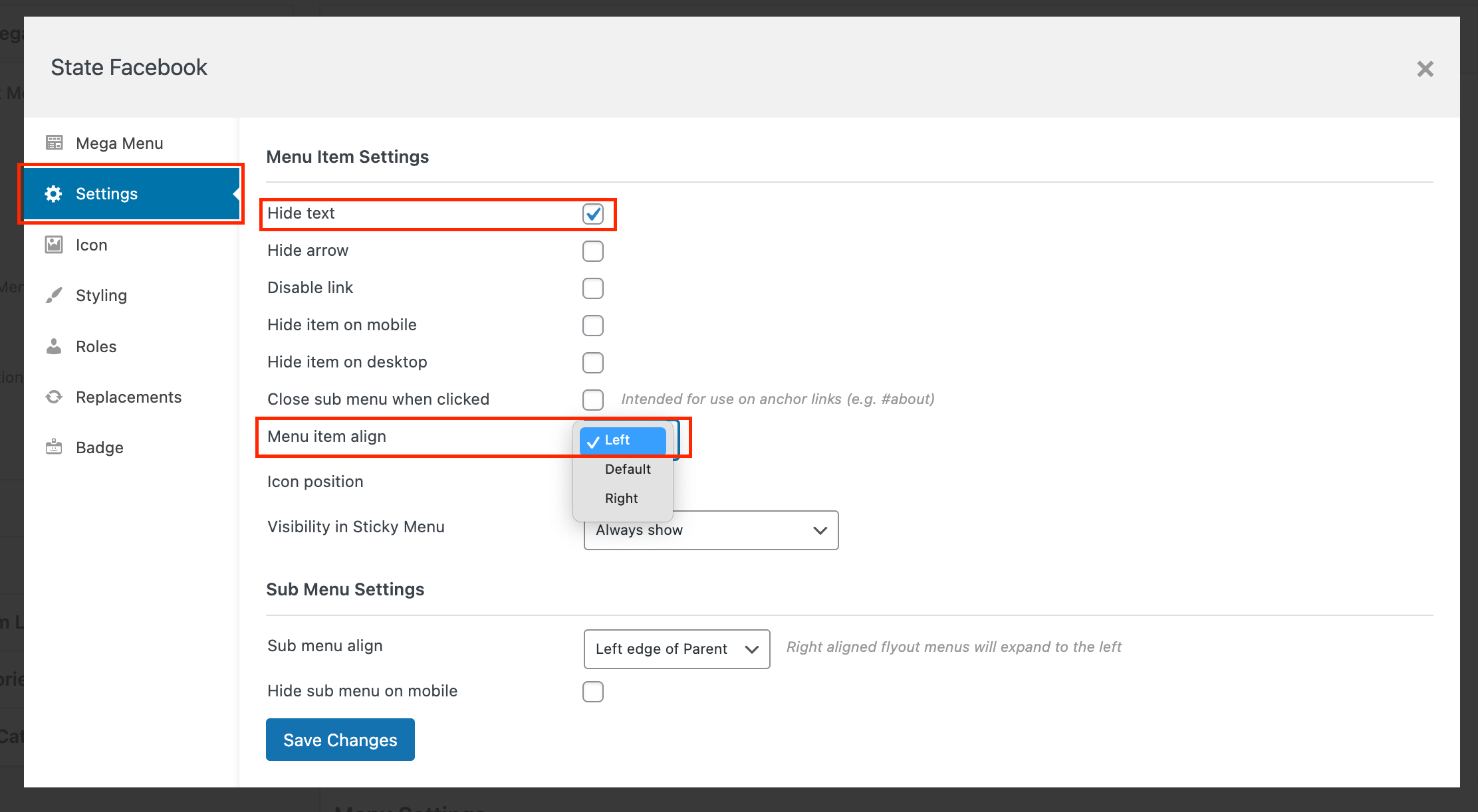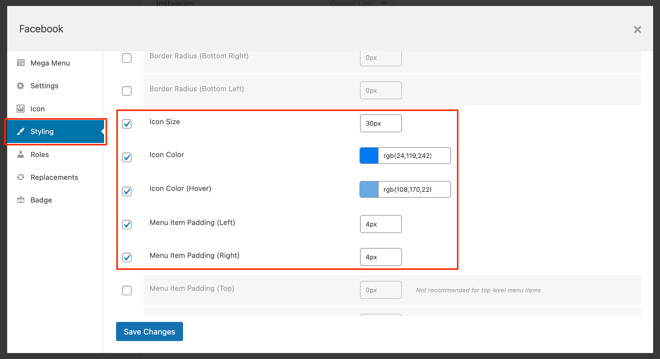In Styling, scroll down to the options to adjusting the icon size, icon color, icon color (hover), and menu item padding. To match the style of the other items, you will want to have your Icon Size set to 30px and Item Padding set to 4px on the left and right.