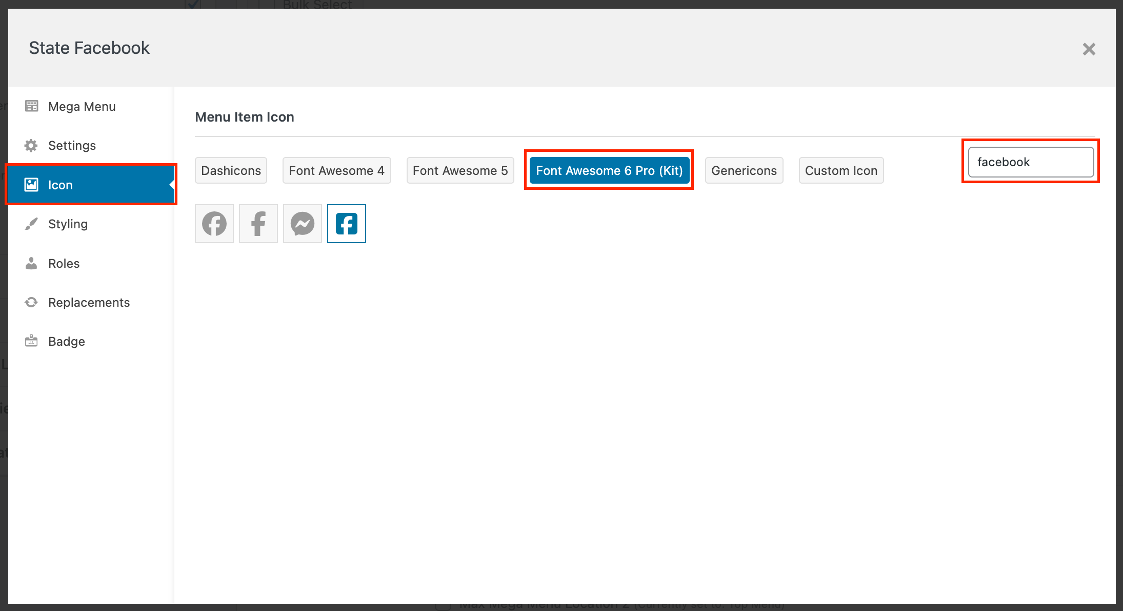 To change the icon, go to the Icon Menu in the Mega Menu. We suggest choosing an icon from Font Awesome 6 Pro (Kit) to ensure all the icons are aligned properly. You can select an icon from the list or search for one using the search bar.