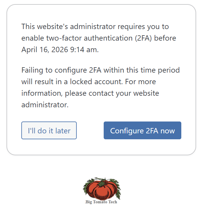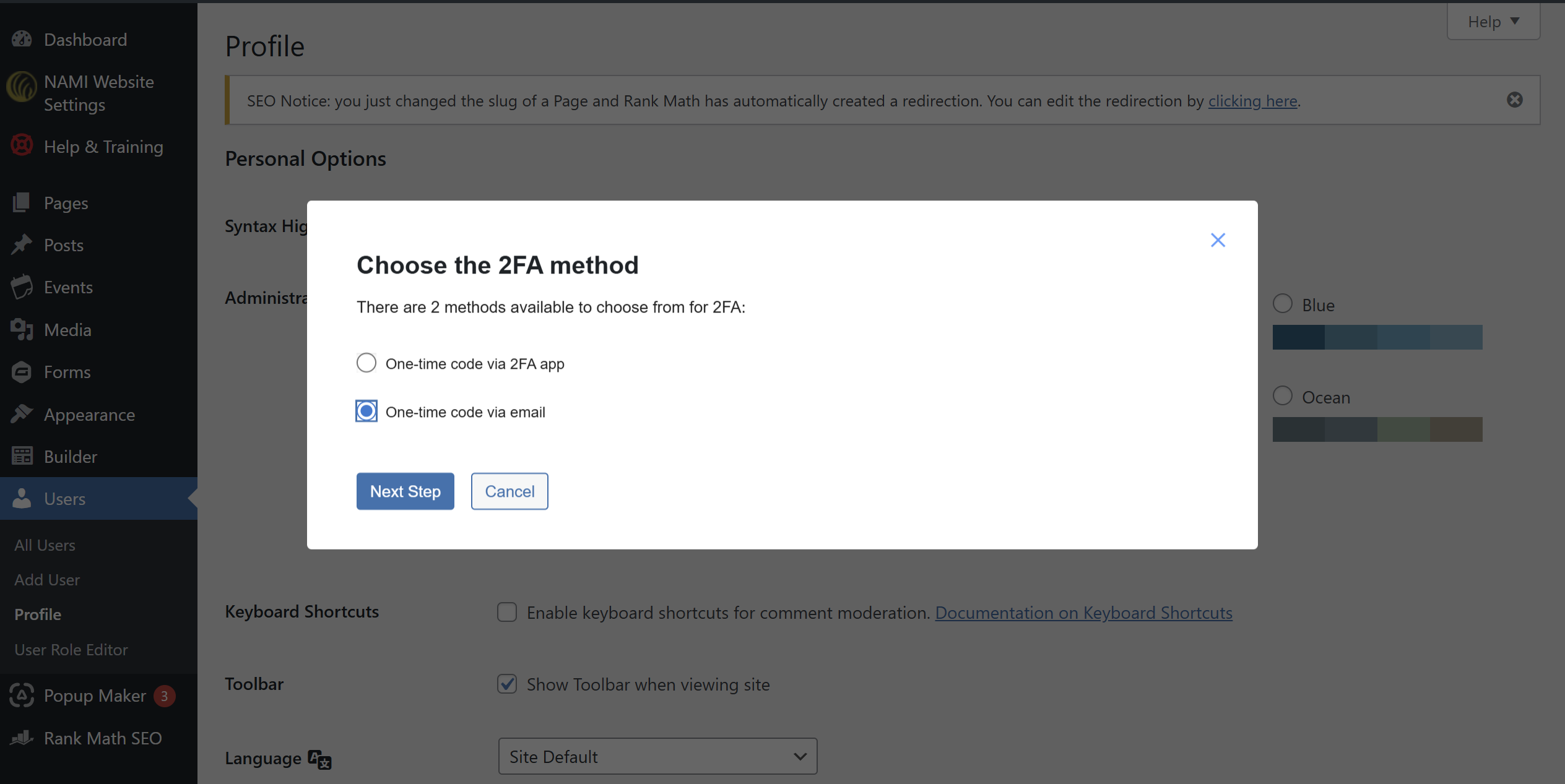 When you log into your account for the first time, you will be prompted to set up a two-factor authentication method (2FA). 2FA requires you enter a one-time code when you log in to ensure the security of your account and that of the entire network of websites.