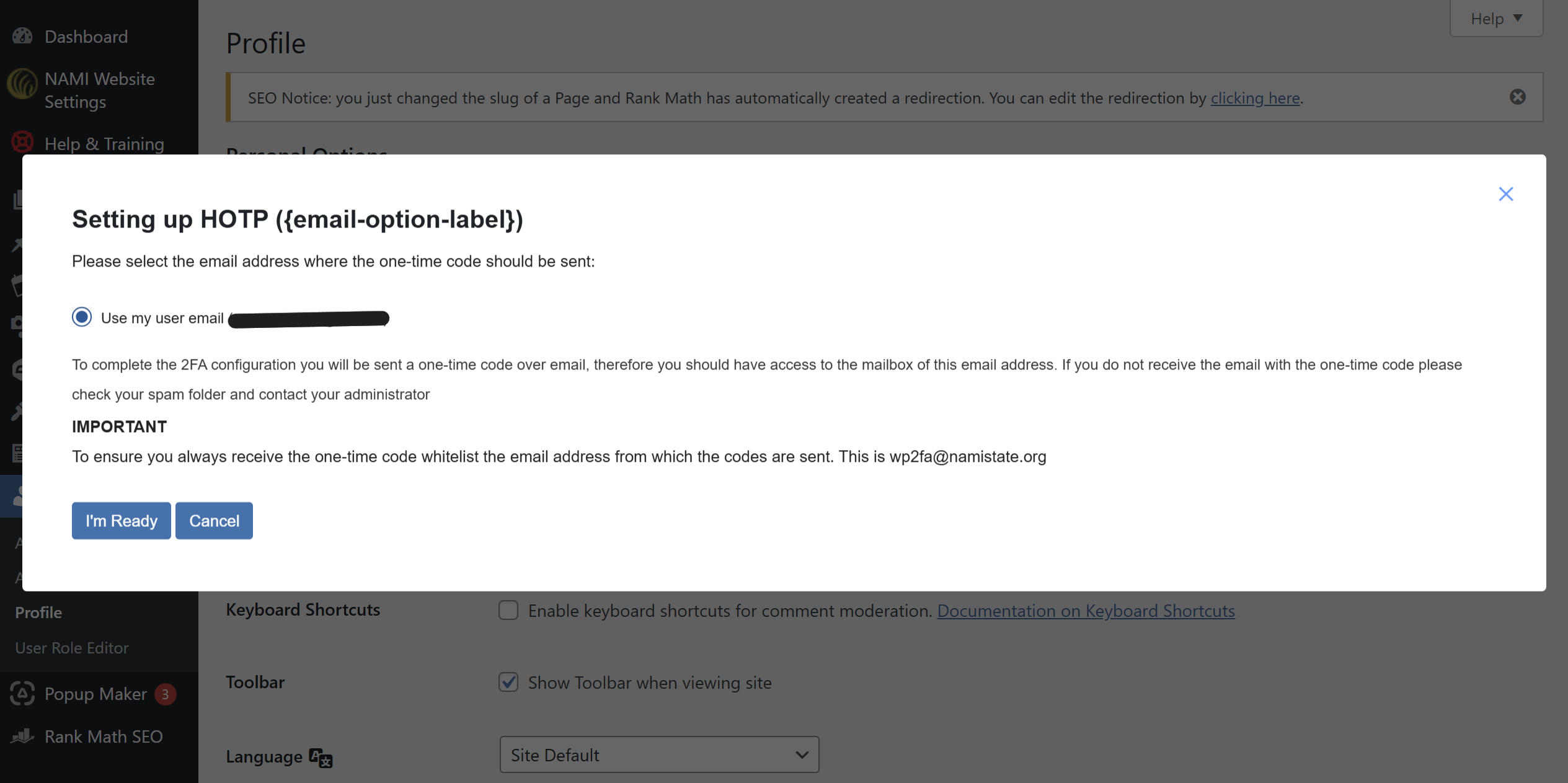 If you don't see the code in your spam folder, whitelist the email wp2fa@namistate.org and click Send me another code.