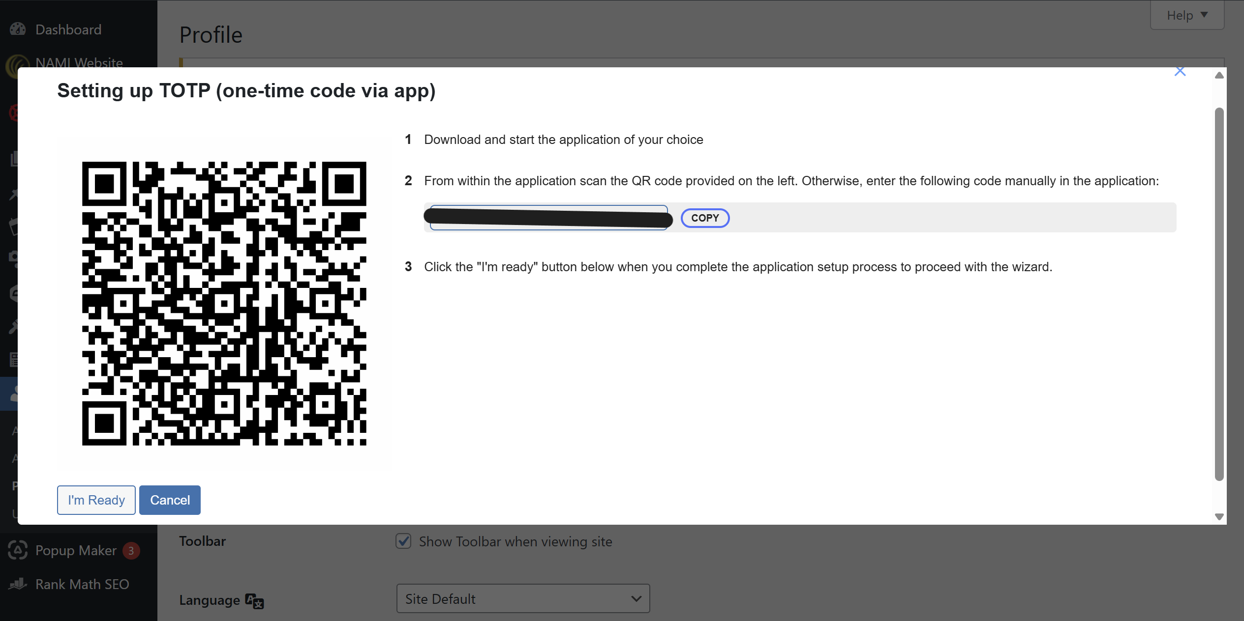 Once done, you should see an entry for your website in your app that generates a new code every minute. Back on your website, click I'm Ready.