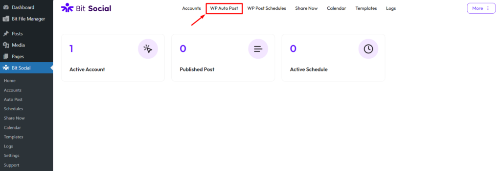 To set up the WP Auto Post feature in Bit Social, go to Bit Social and click on “WP Auto Post” from the top menu.