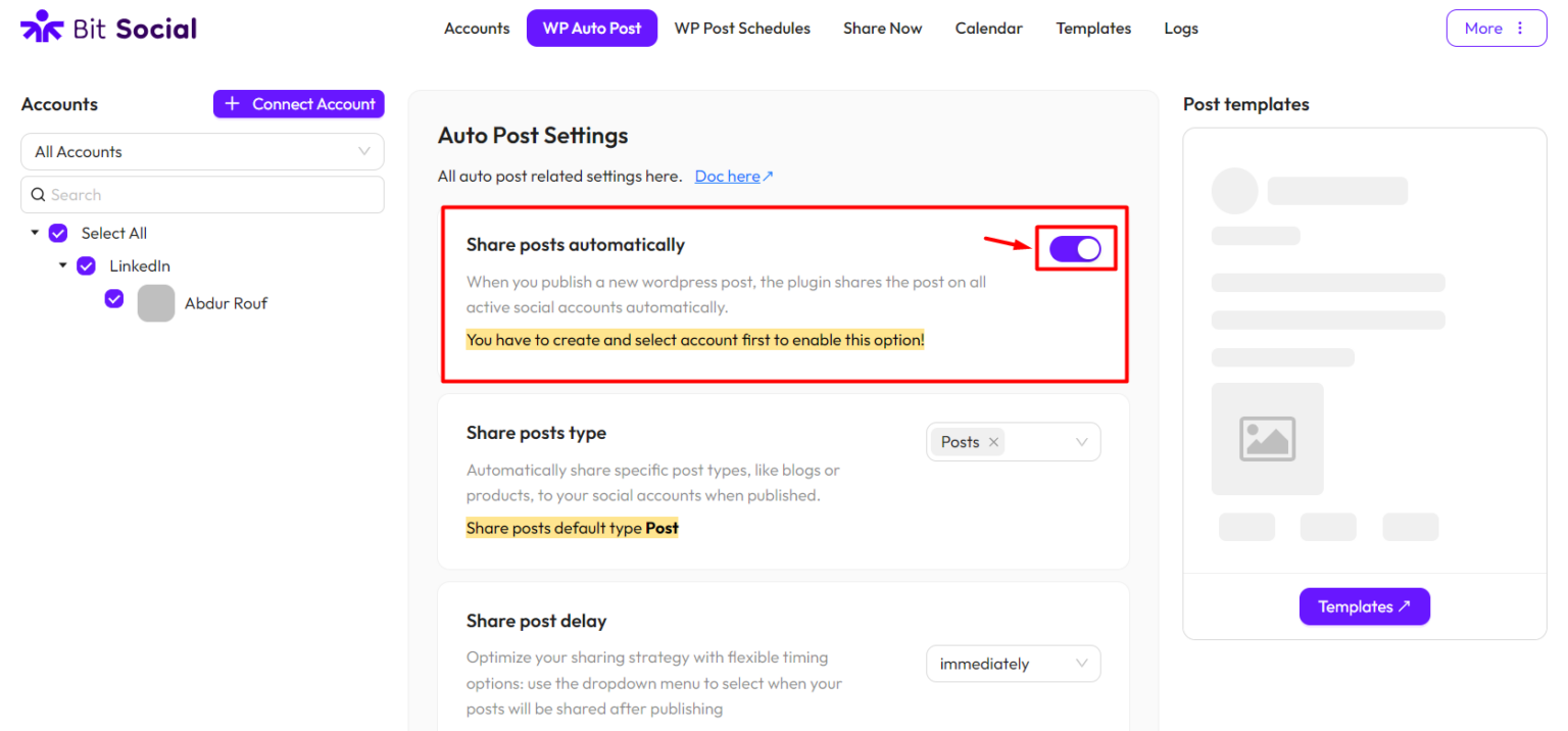 Share posts automatically: You cannot enable this option until you select your accounts from the left-side bar. When this option is enabled, any time you publish a new post in WordPress, the plugin will automatically share it on all your selected social accounts.