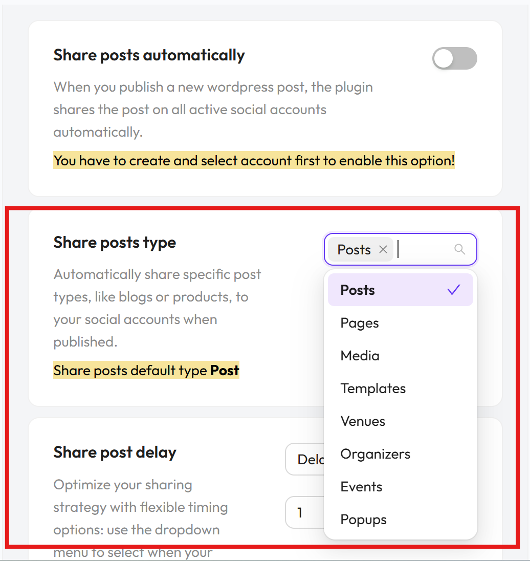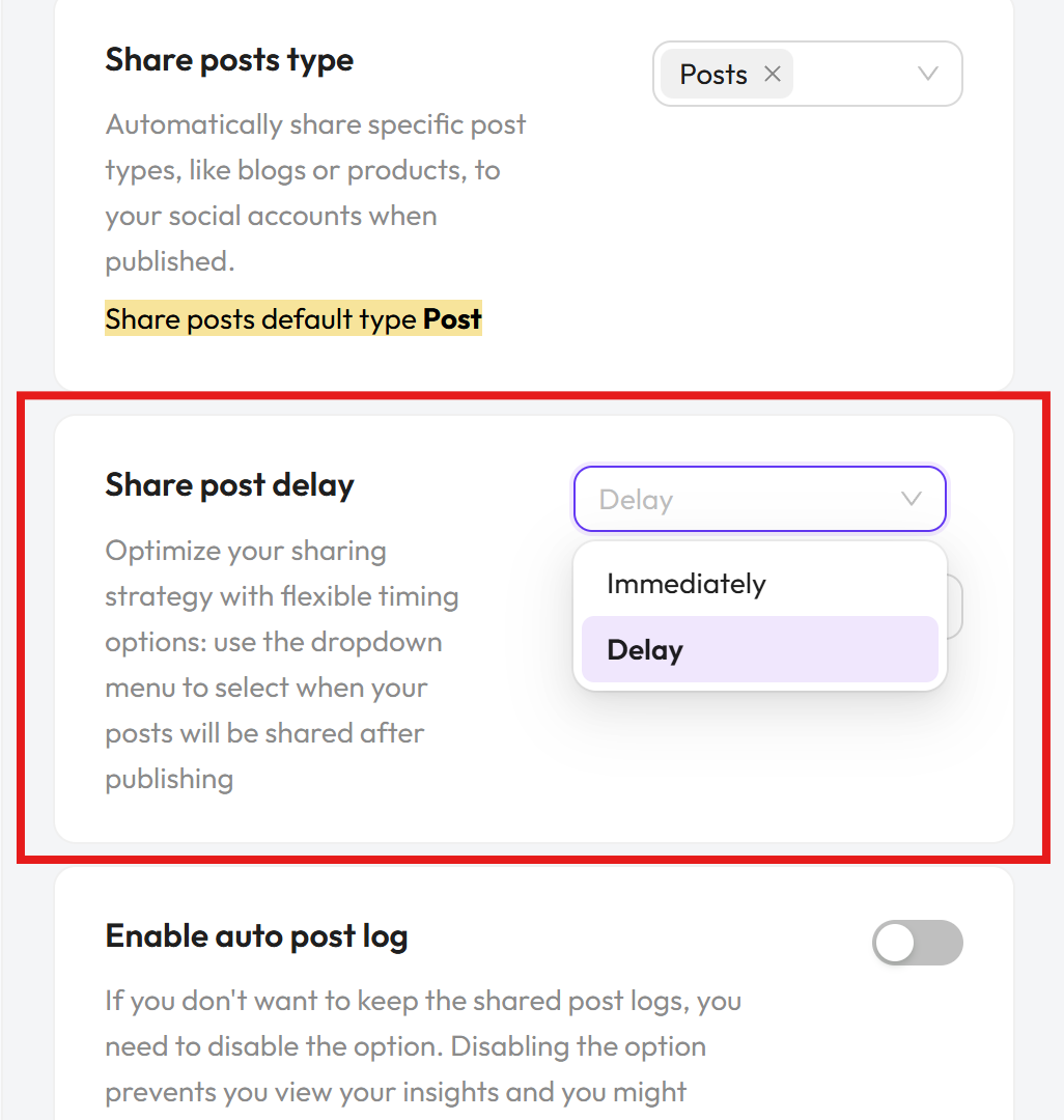 Share post delay: You can control when your WordPress posts are automatically shared. You can either post right away or set a delay time. If you choose the delay option, your posts will be shared to your social platforms after the specified time.