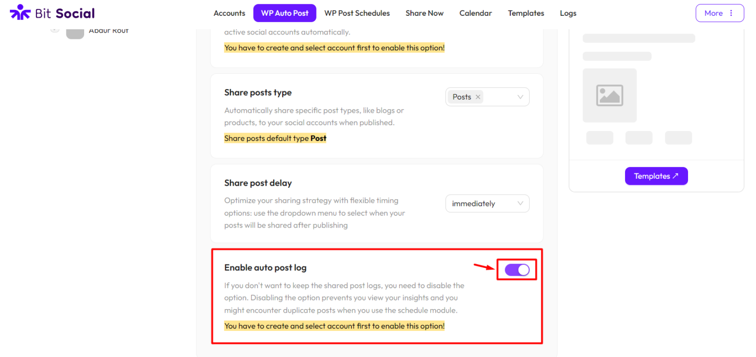 Keep the shared post log: When this option is enabled, all your shared posts will be recorded in the log section, where you can review them. If you prefer not to keep these logs, you can disable the option. However, disabling it will prevent you from viewing insights and may lead to duplicate posts when using the scheduling module. You cannot enable this option until you select your accounts from the left-side bar.