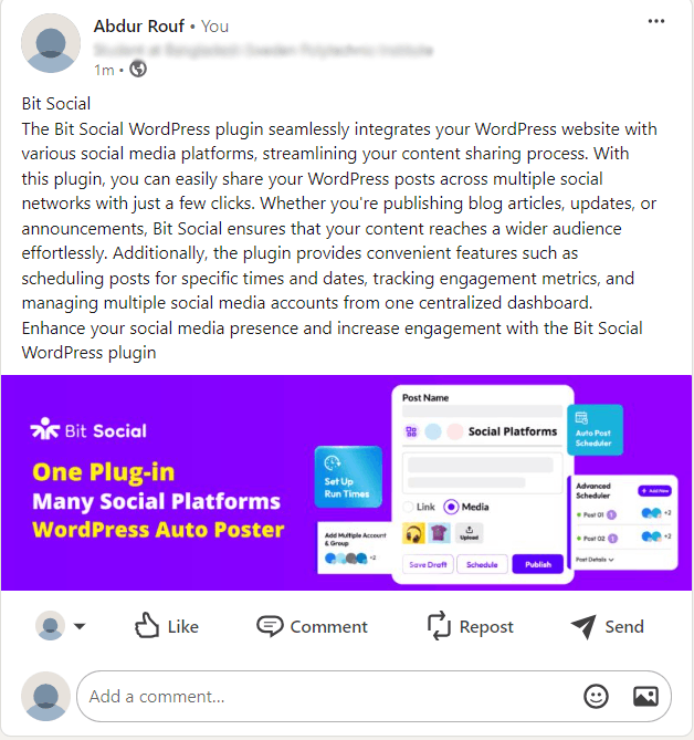 With Bit Social’s WP Auto Post feature, whenever you publish a post on WordPress, it will automatically be shared on your connected social media platforms. This makes it easier to distribute your content across multiple channels.