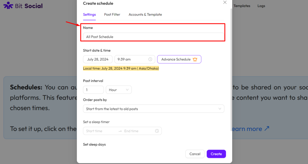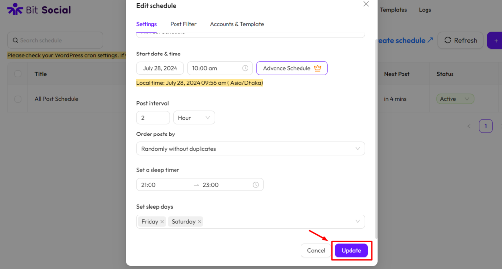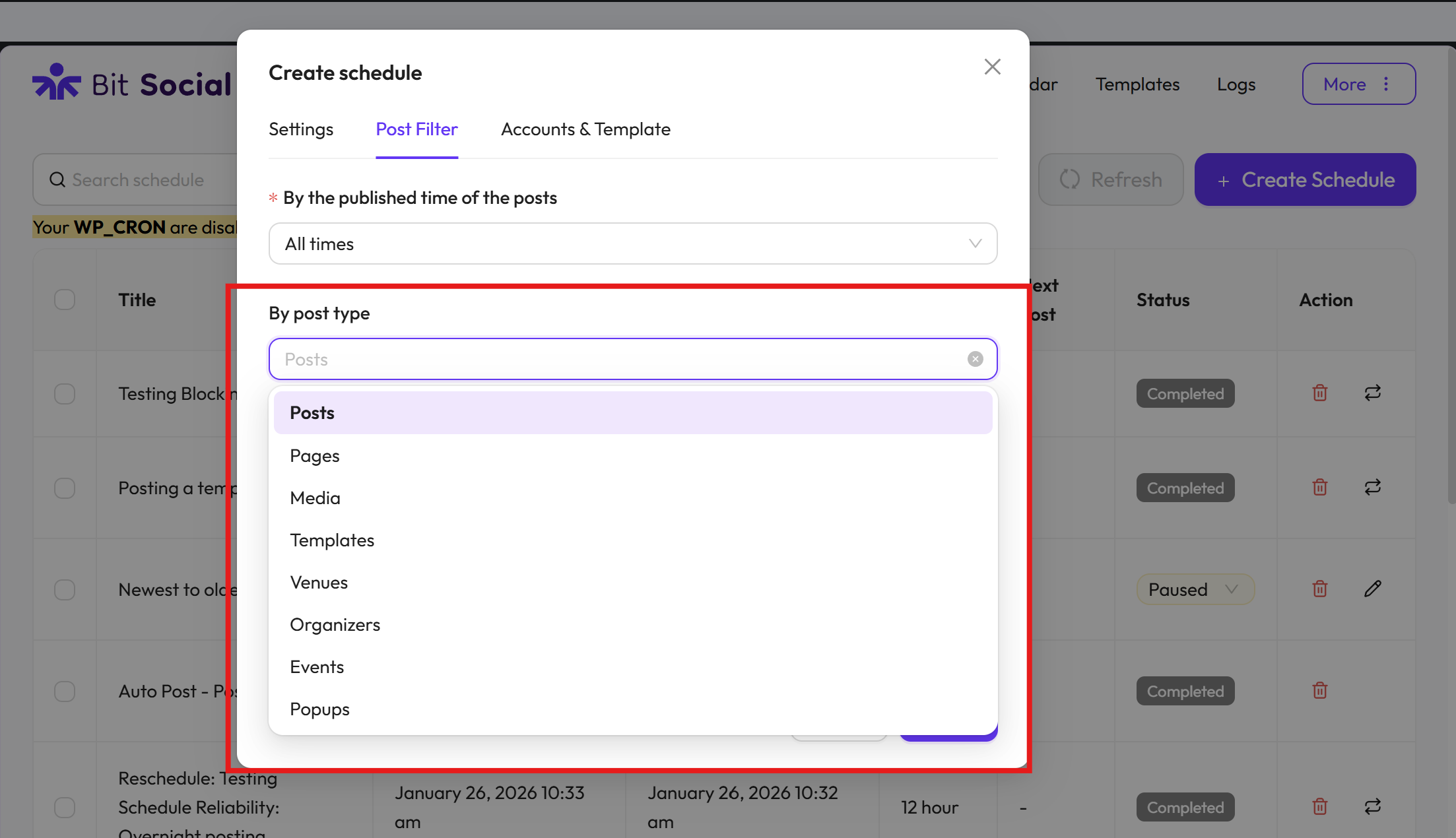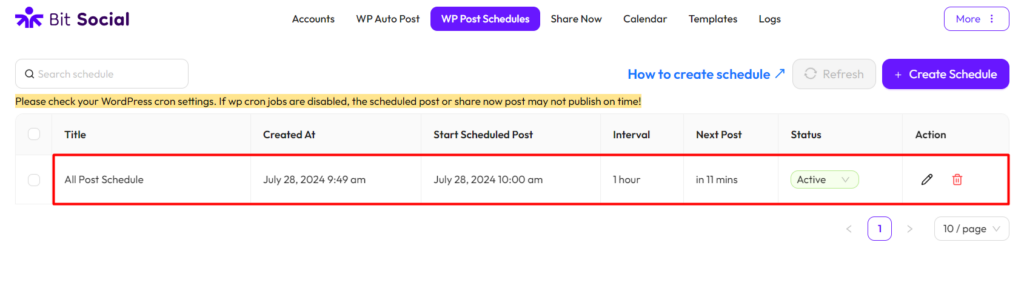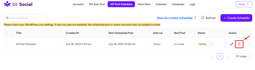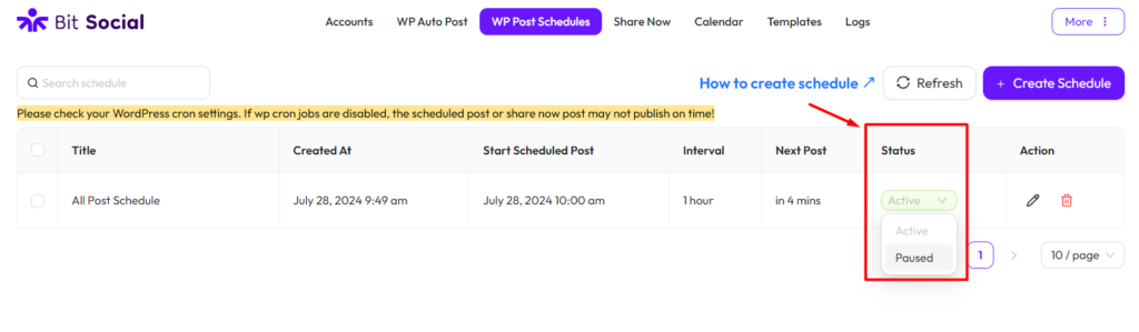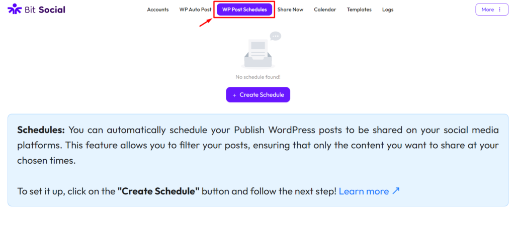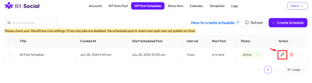 To set up the WP Post Schedules feature in Bit Social, go to Bit Social and click on “WP Post Schedules” from the top menu then “Create Schedule“.