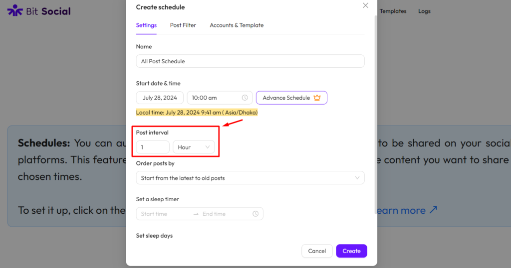 Post interval: The post interval feature lets you set the amount of time between each automatically shared post. This helps you maintain a consistent and well-spaced sharing schedule on your connected platforms.