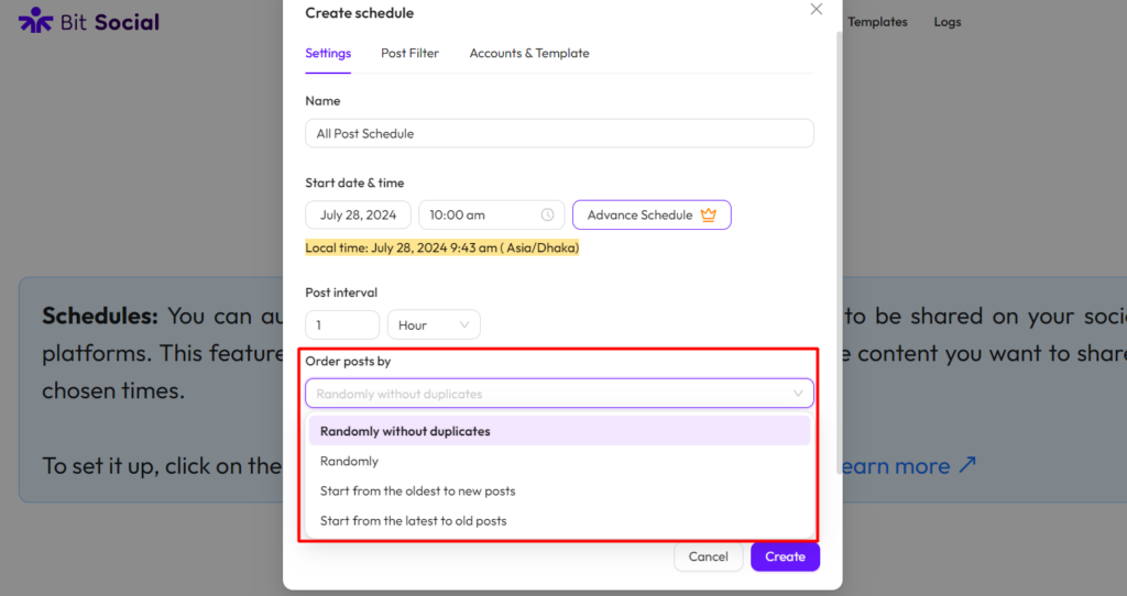 Order posts by: The “Order Posts By” feature in Bit Social lets you decide the sequence of your shared posts. You can choose to share posts in different ways: