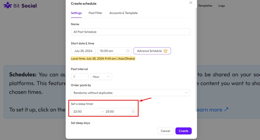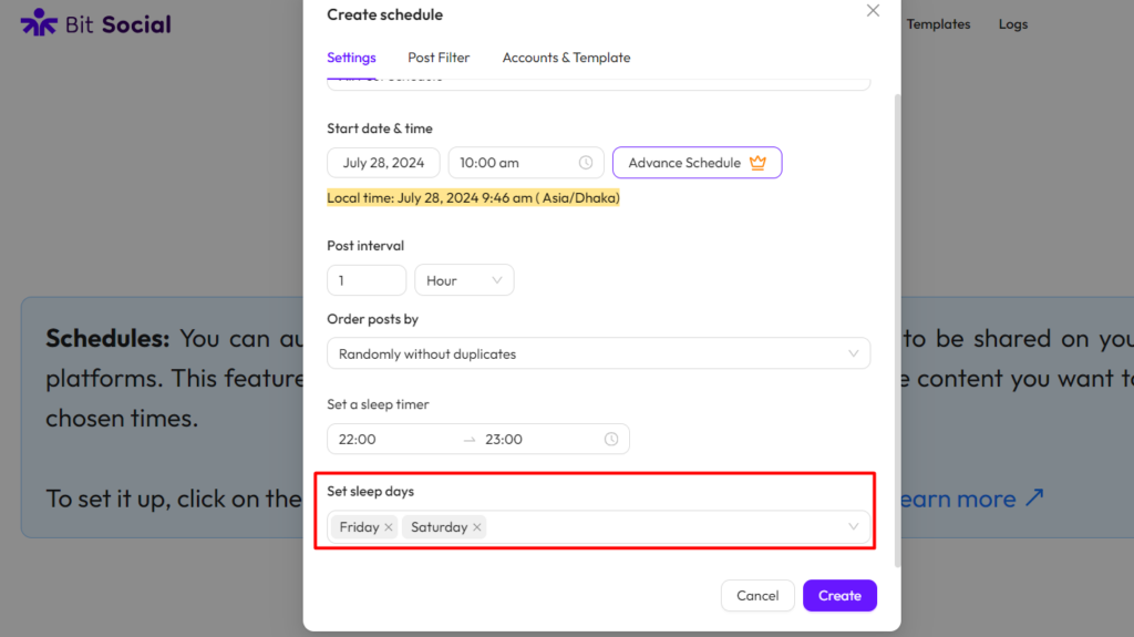 After setting up your schedule, click the “Create” button.