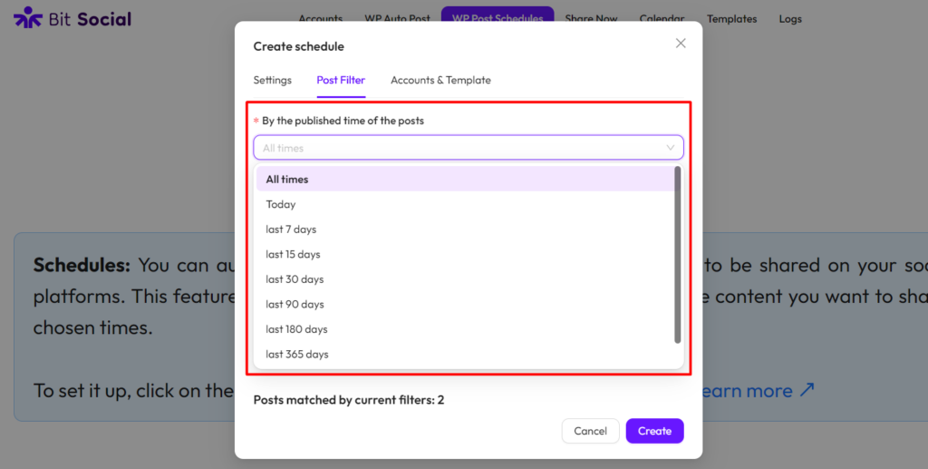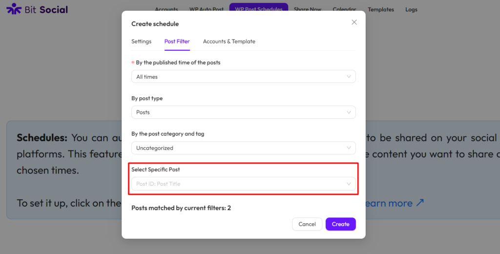 With the WP Post Schedules feature in Bit Social, you can automatically schedule your all WordPress posts to be shared on your social media platforms. This feature allows you to filter your posts, ensuring that only the content you want gets shared at the optimal times.