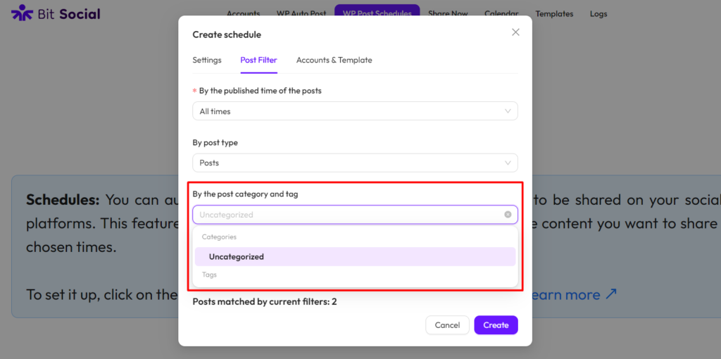 By the post category and tag: With this feature, you can filter your WordPress content by category and tag. This means you can choose to share only posts from specific categories or with certain tags to your selected social platforms.