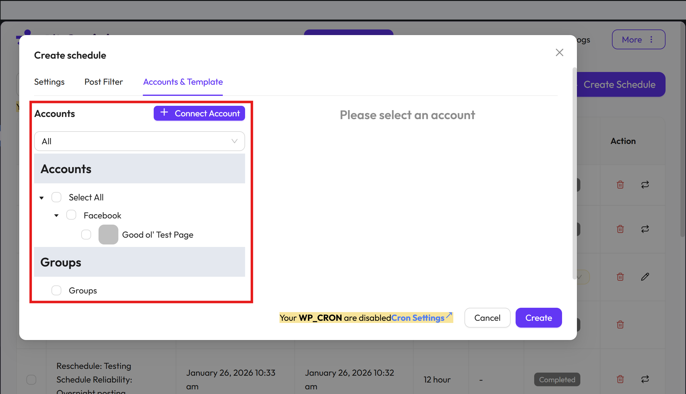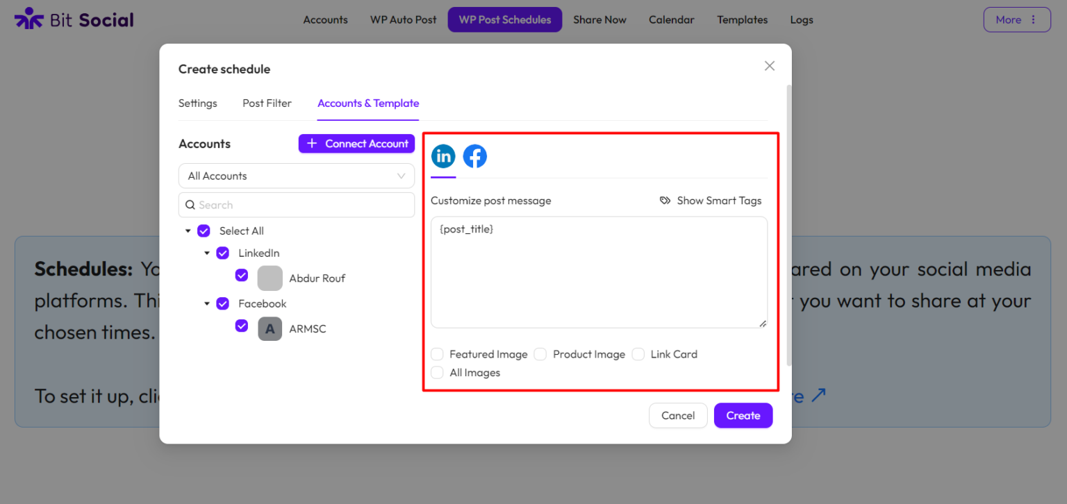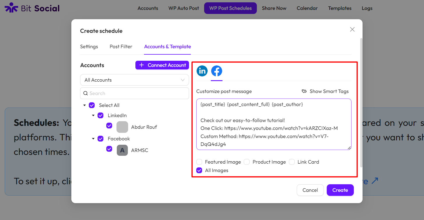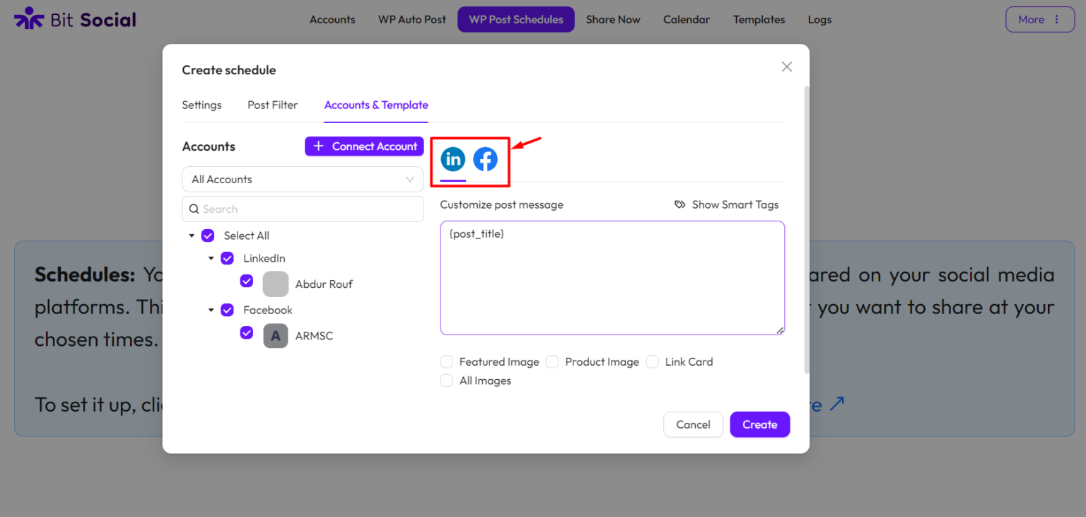 Choose Accounts: Choose the accounts from the left-side where you want to schedule your WordPress posts to be shared. You can also search for your accounts and filter them by platform. Click here to learn how to connect your accounts.